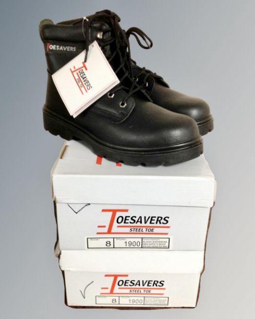 Two pairs of Toesavers steel toe-capped boots, size 8, boxed and new.