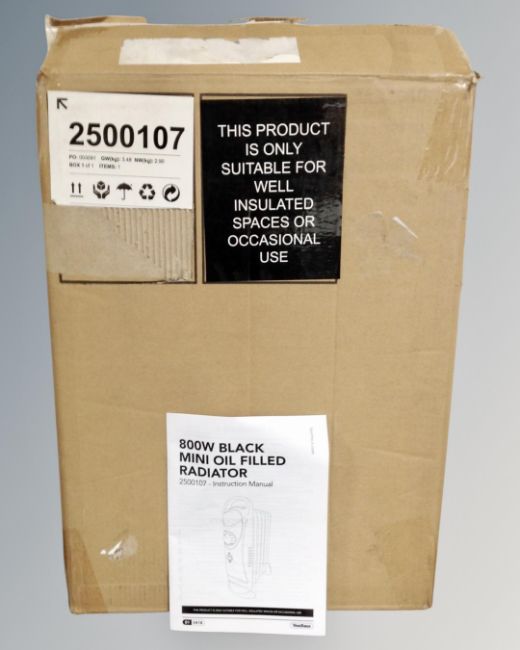 A Von Haus 800W black mini oil filled radiator, boxed.