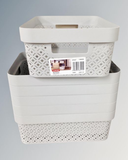 Six Curver Terrazzo storage caddies.