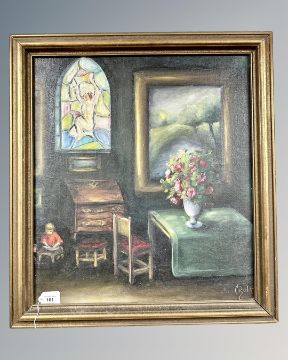 Crult : Interior setting with stained glass window, oil on canvas, 52 cm x 47 cm.