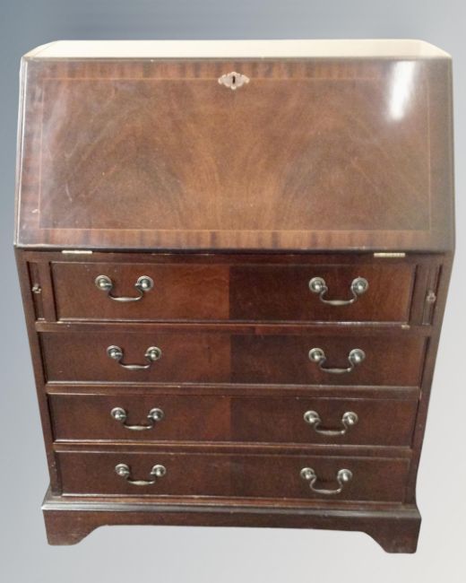 A reproduction inlaid mahogany bureau fitted four drawers