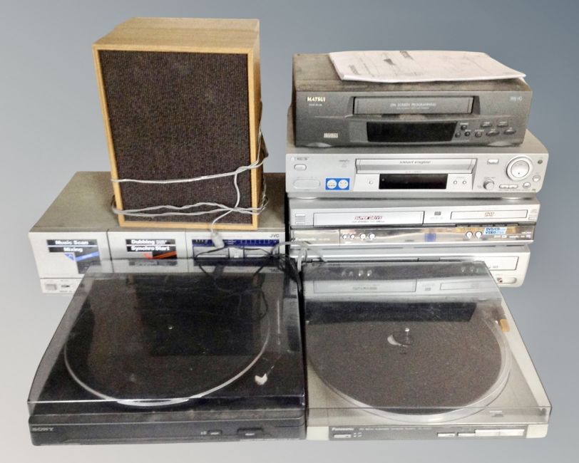 A Sony stereo turntable together with a Panasonic automatic turn table, JVC double cassette deck, pair of speakers, four assorted VCR and DVD recorders, Sony and Panasonic etc