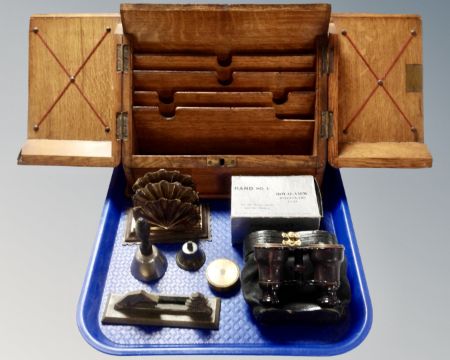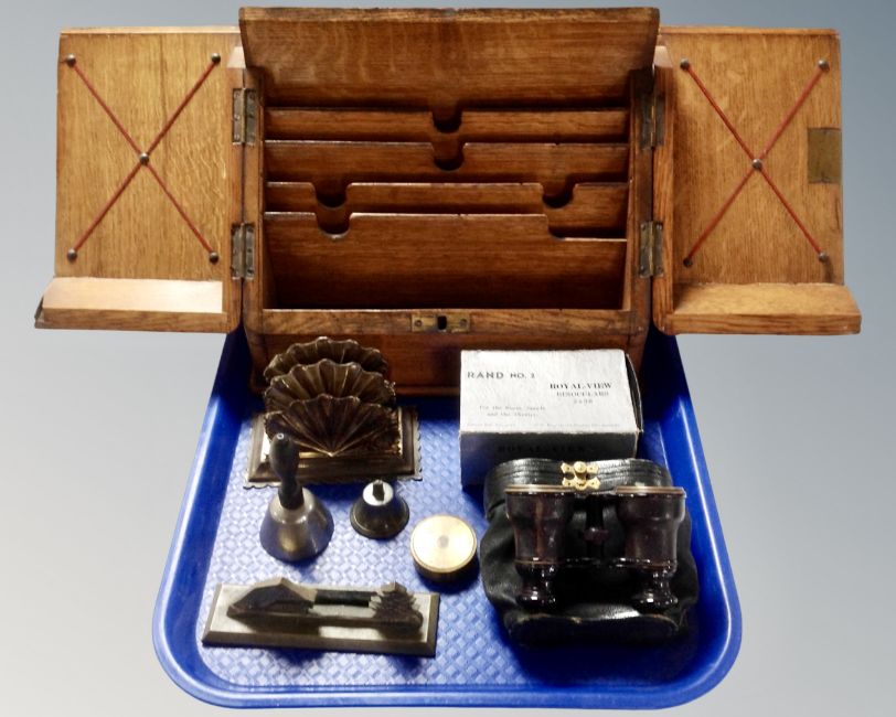 A Victorian oak correspondence box together with brass letter rack, miniature hand bell, 3 x 30 binoculars, field glasses etc