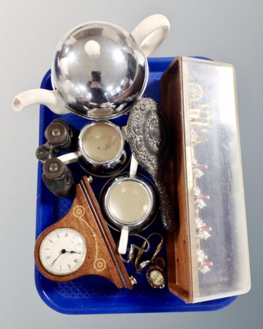 A tray of Queen Elizabeth silver jubilee Royal State coach in display case, Everhot three piece tea service, white metal embossed hand mirror, costume jewellery, Du-Mont field glasses