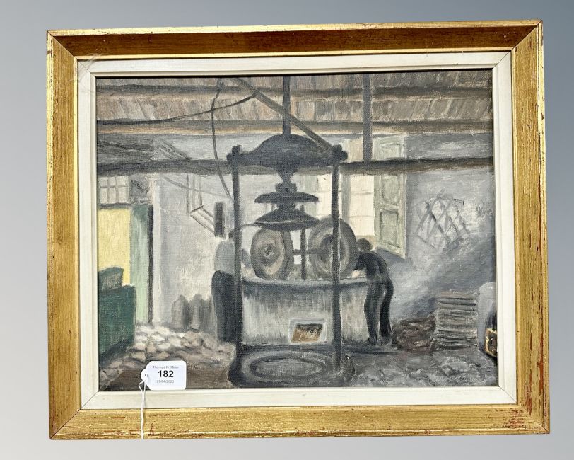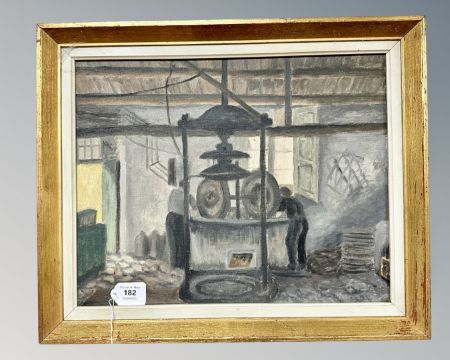 Continental School : Two figures working in a mill, oil on canvas, 40 cm x 32 cm