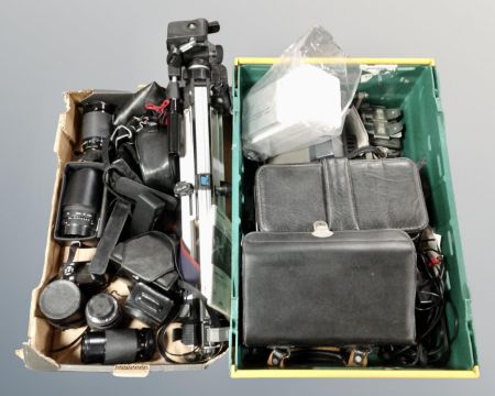 Two boxes of vintage cameras, lenses, tripods, accessories etc