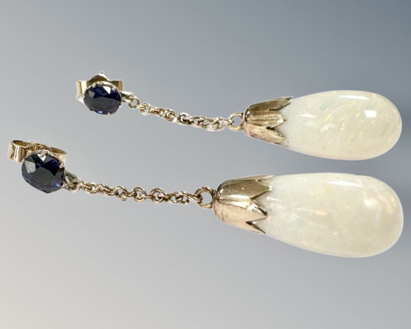 A pair of Edwardian opal and sapphire droplet earrings, with post fittings, overall length 39mm.