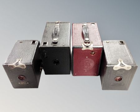 Four vintage boxed brownie cameras.