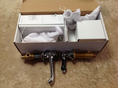 A traditional 3TH black lever basin mixer tap and pop-up waste, boxed.