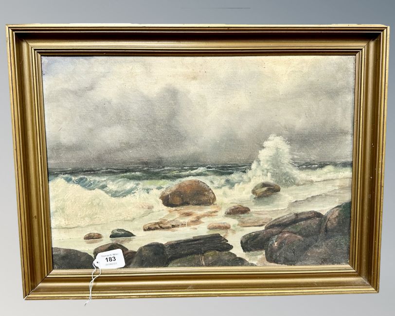 Continental School : Waves crashing against rocks, oil on canvas, 46 cm x 31 cm