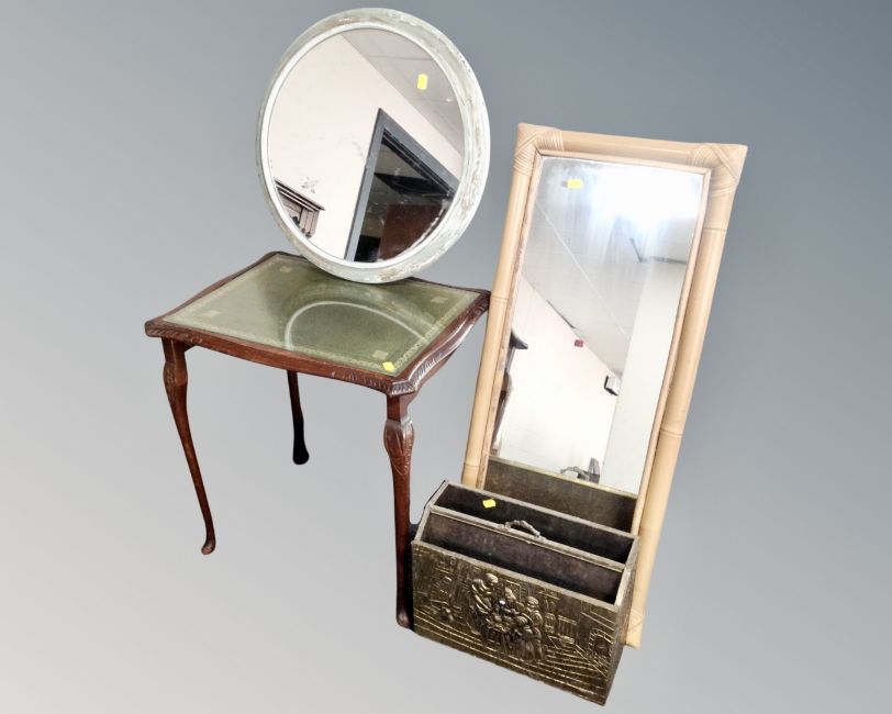 A stained beech occasional table with leather inset panel and glass top together with two wall mirrors and brass embossed magazine rack