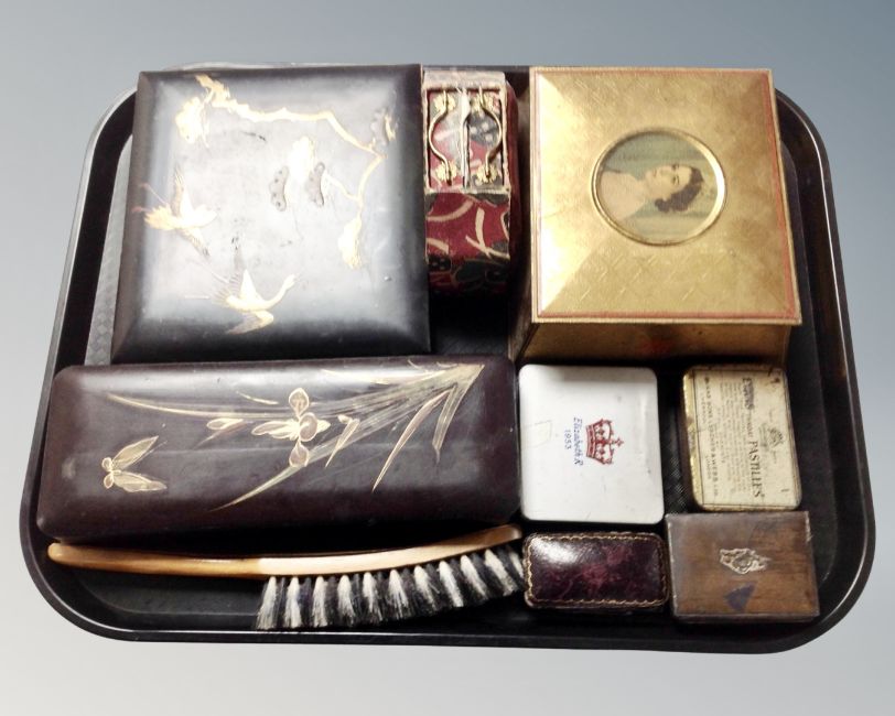 A tray of 20th century Japanese lacquered table boxes, vintage tins, 19th century pin cushion etc