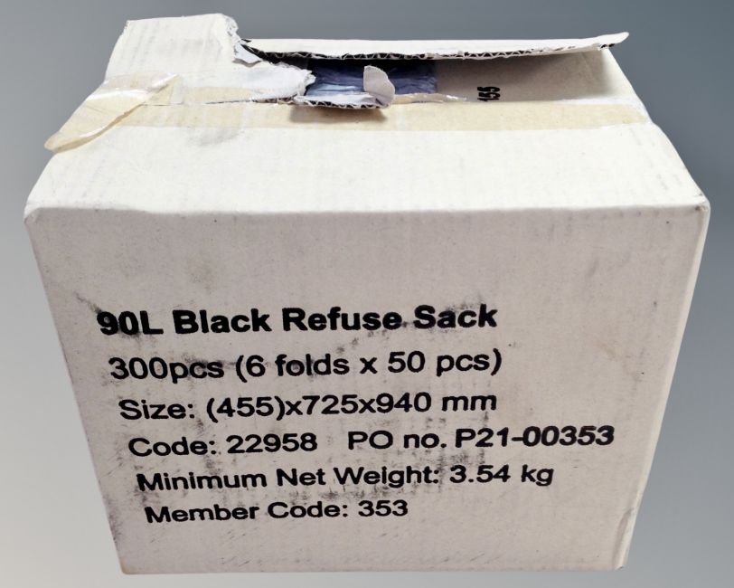 A box of 300 90 litre black refuse sacks (new)