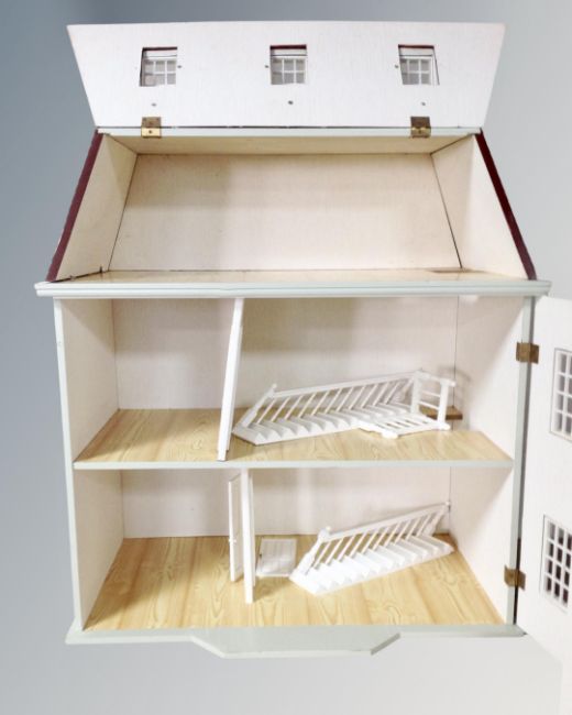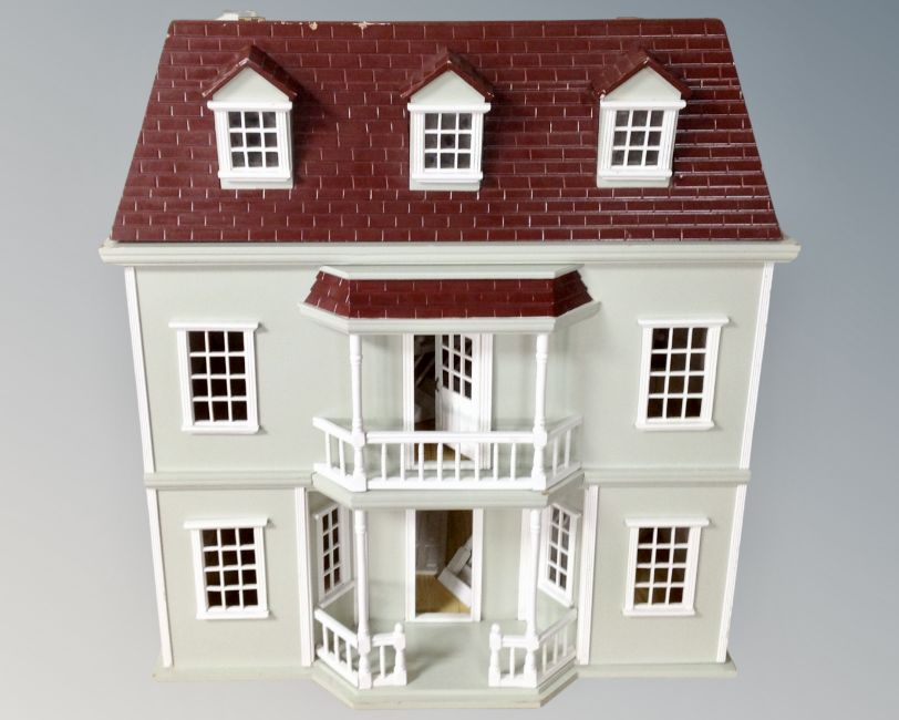 A 19th century style dolls house together with a box of dolls and furniture