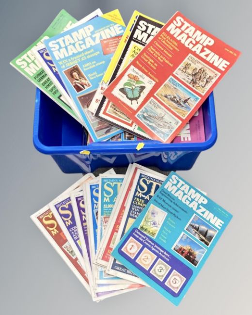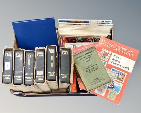 Two boxes containing six first day cover albums, together with magazines and books relating to stamp collecting.
