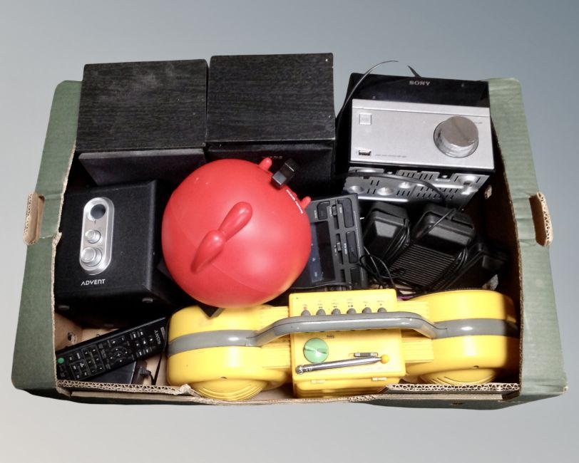 A crate containing Sony micro hifi, speakers, novelty radios, radio recorder etc