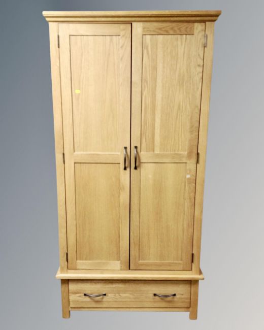 A contemporary oak double door wardrobe fitted with a drawer