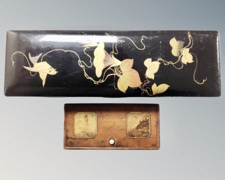 A Japanese lacquered trinket box containing a pair of antique spectacles, silver vesta case, further silver plated and enamelled vesta case with Newcastle upon Tyne crest, trinket box containing studs and cufflinks etc