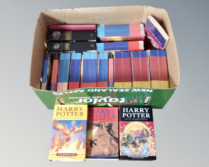 A box of hard and soft back Harry Potter volumes
