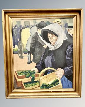 Continental School : A lady selling vegetables, oil on board, 77 cm x 66 cm, indistinctly signed.
