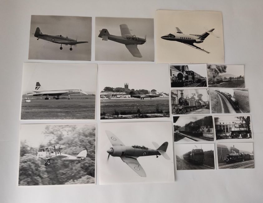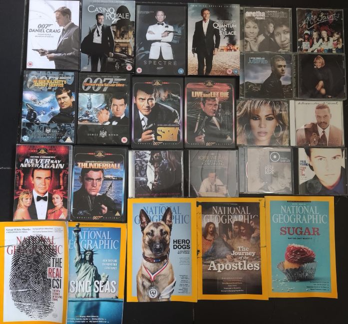 Vintage aeroplane and locomotive photographs together with National Geographic books, together with James Bond DVDs and music CDs.