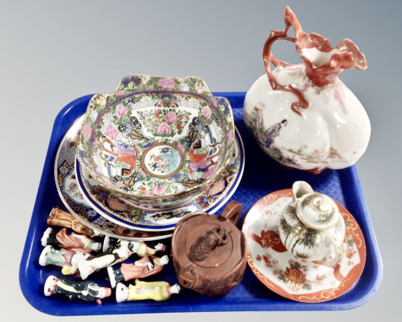 A tray containing assorted oriental ceramics including a 20th century Cantonese famille rose bowl figures, wall plaques, Japanese geisha jug etc.