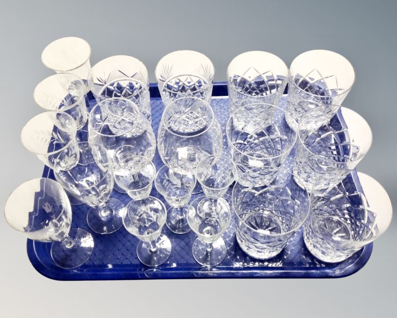 A tray containing assorted glass and lead crystal drinking vessels.