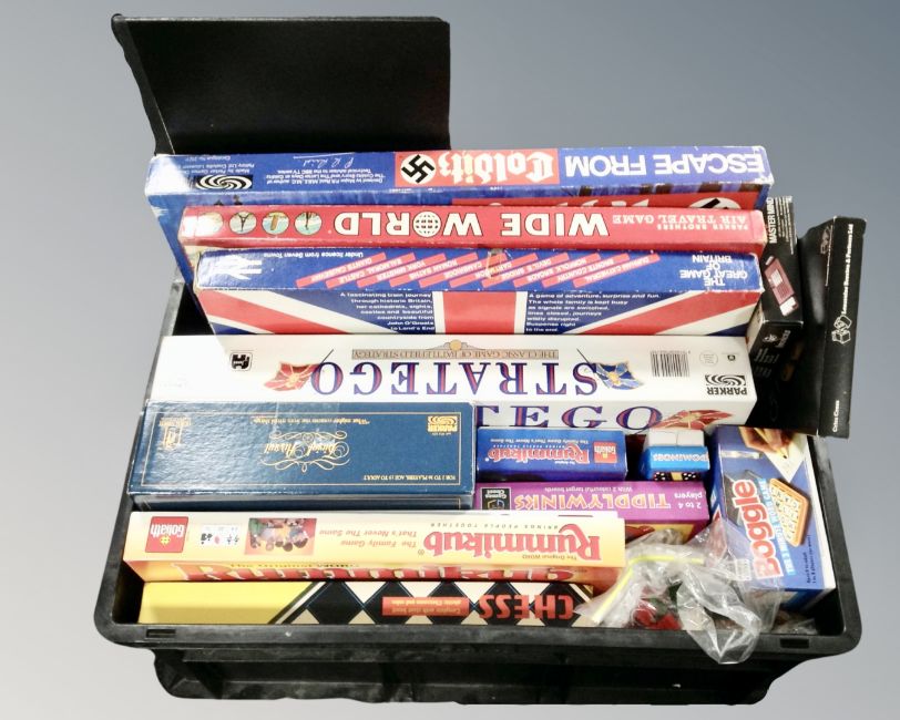A crate containing assorted board games including Escape from Colditz, Trivial Pursuit, Stratego.