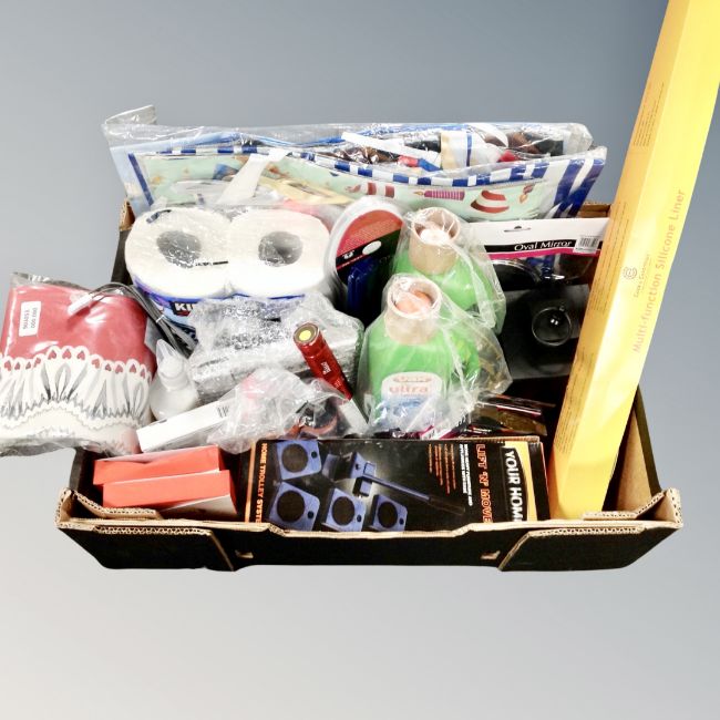 A box containing a Lift N Move furniture moving kit, Vax floor cleaning fluid, gift bags, multi-function silicone liner, baby foot exfoliation peel etc., all parts new.