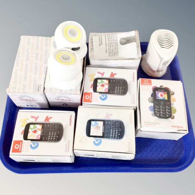 A tray containing four Vodaphone 354 mobile phones, boxed, together with a Must Have Ideas Minifresh fridge purifier and two pairs of 3-in-1 ball lights.