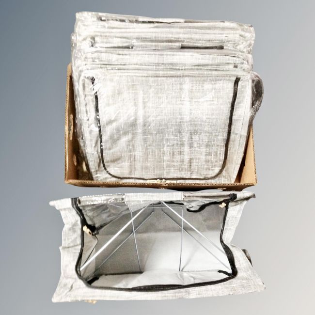 Nine fabric pop up storage boxes, new.