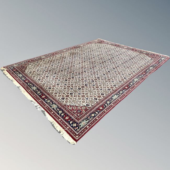 An Indian carpet on red and cream ground, 296cm by 396cm.