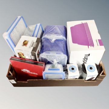 A box containing kitchenalia including Piranha peelers, tupperware, dishes, a Nova slice and dice, Tefal storage boxes etc., all parts new.