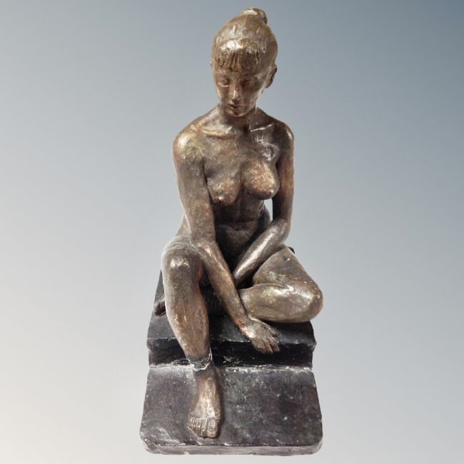 A large heavy bronzed figure of a nude lady sitting on a pedestal.