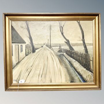 Continental school : Snow on a road, oil on canvas, 65cm by 50cm.