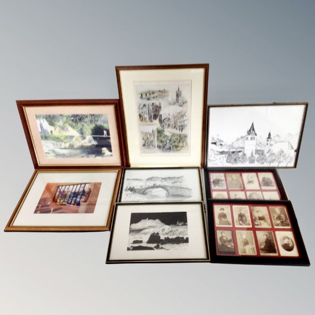 A box containing assorted pictures together with two sets of eight antiquarian monochrome photographs in frames.