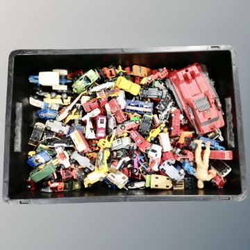 A box containing a quantity of play worn die cast and plastic vehicles including Corgi juniors 007 Lotus Esprit, Dinky, Matchbox etc.