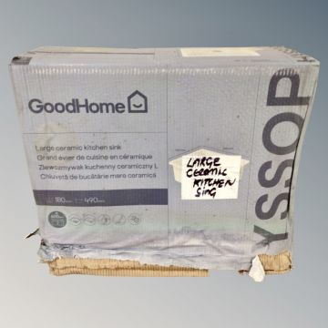 A boxed ceramic kitchen sink, 565mm across.