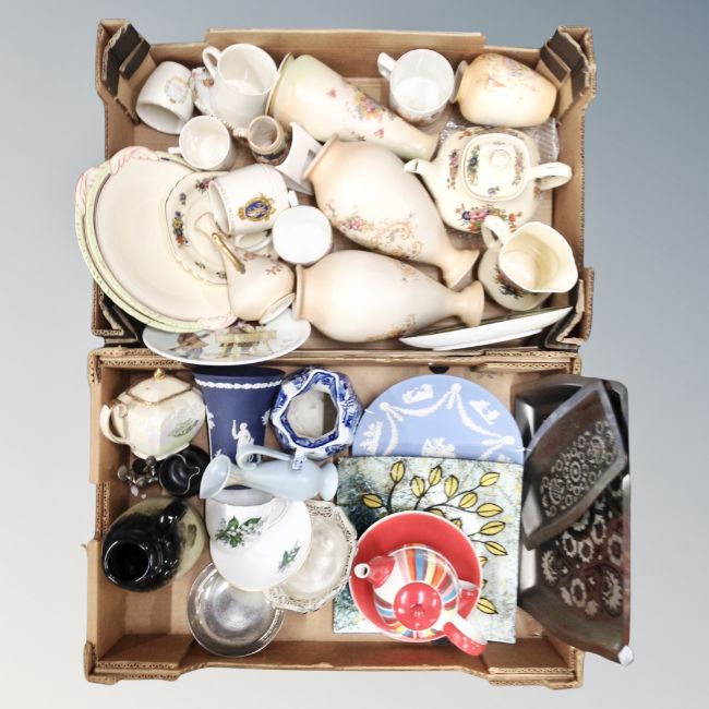 Two boxes containing assorted ceramics and metalware including Masons willow pattern jug, Wedgwood Jasperware vase, Crown Ducal etc.