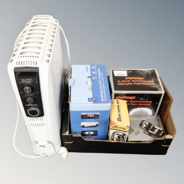 An oil filled Delonghi radiator together with a box containing an oscillating fan, security shredder etc.