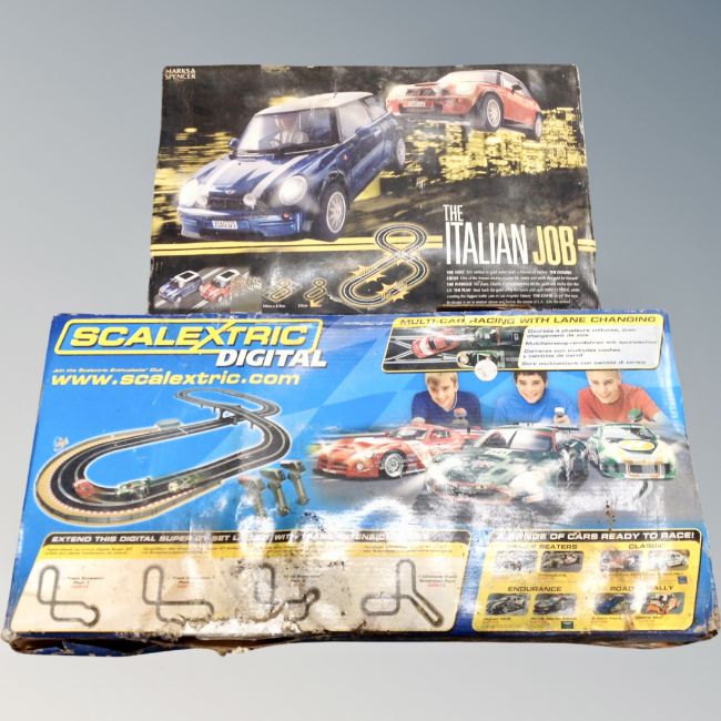 A box containing a Scalextrics Digital Super GT together with Italian Job Marks and Spencer slot racing set. (AF)