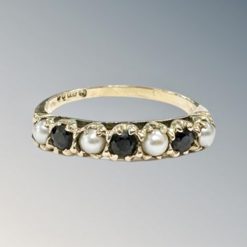 A 9ct yellow gold sapphire and seed pearl dress ring, size N/O, 1.8g.