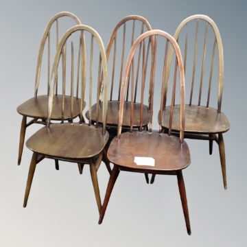 A set of five Ercol elm and beech spindle back dining chairs in an antique finish together with a further Ercol armchair.