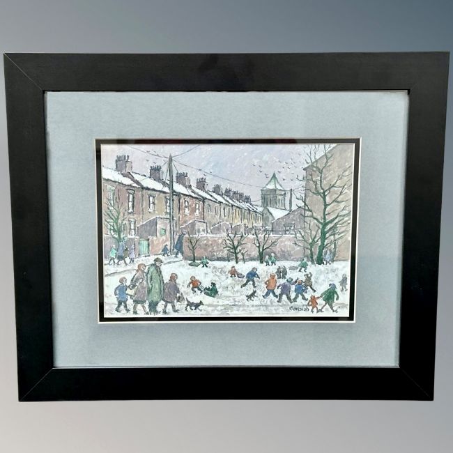 Norman Stansfield Cornish MBE (1919-2014) Spennymoor street scene with children playing in the snow, oil on board, signed lower-right, 28cm by 20cm, NC074 exhibition label, subject to Artist's Resale Rights/Droit de Suite.