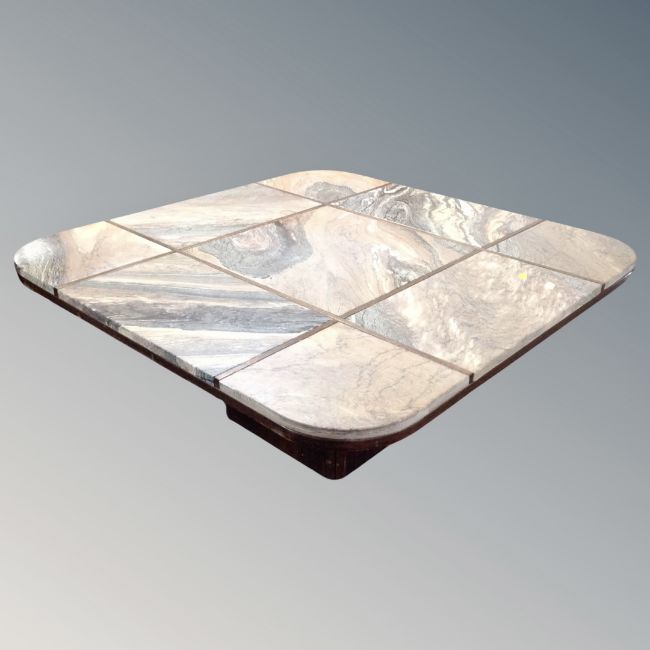 A late 20th century square pedestal coffee table with nine inset granite panels