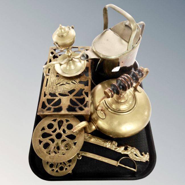 A tray containing antique and later brass wares including watering cans, trivet, kettles, letter openers.