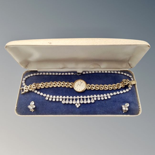 A lady's Rotary gold plated wristwatch together with a costume necklace and earring set in box.