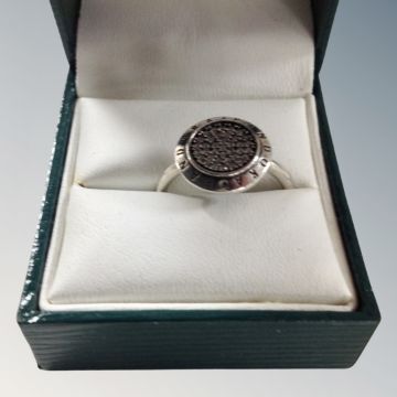 A Pandora silver finger ring with round face, in green box, 3.5g.