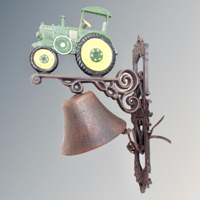 A cast iron bell on tractor wall bracket.