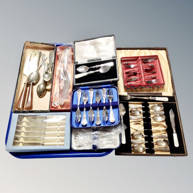 A tray containing a collection of assorted flatware, boxed and unboxed.